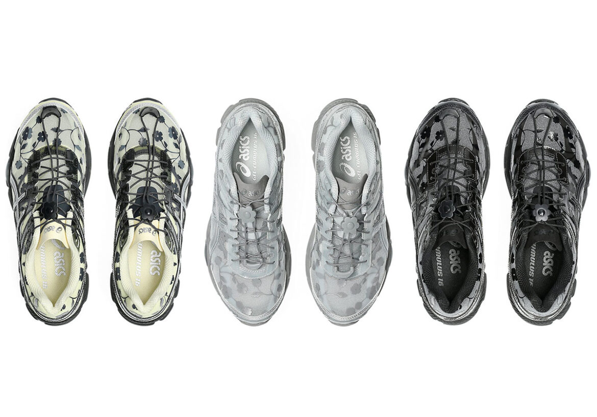 Nonetheless, that trend continues as she chalks off the GEL-Cumulus 16, reviving a 2014 neutral runner adding graphic vines and flowers between its synthetic base and new glossy overlays. Each of those hardware notes is an execution of the femininity vs. masculinity theme at the center of this shoe, the latter further explored with an outdoorsy pull closure. Of the three colorways on offer, two in “”Glacier Grey” and black execute fitting trendy aesthetics, while the “Ivory/Black” option lands with a more adventurous overall palette.