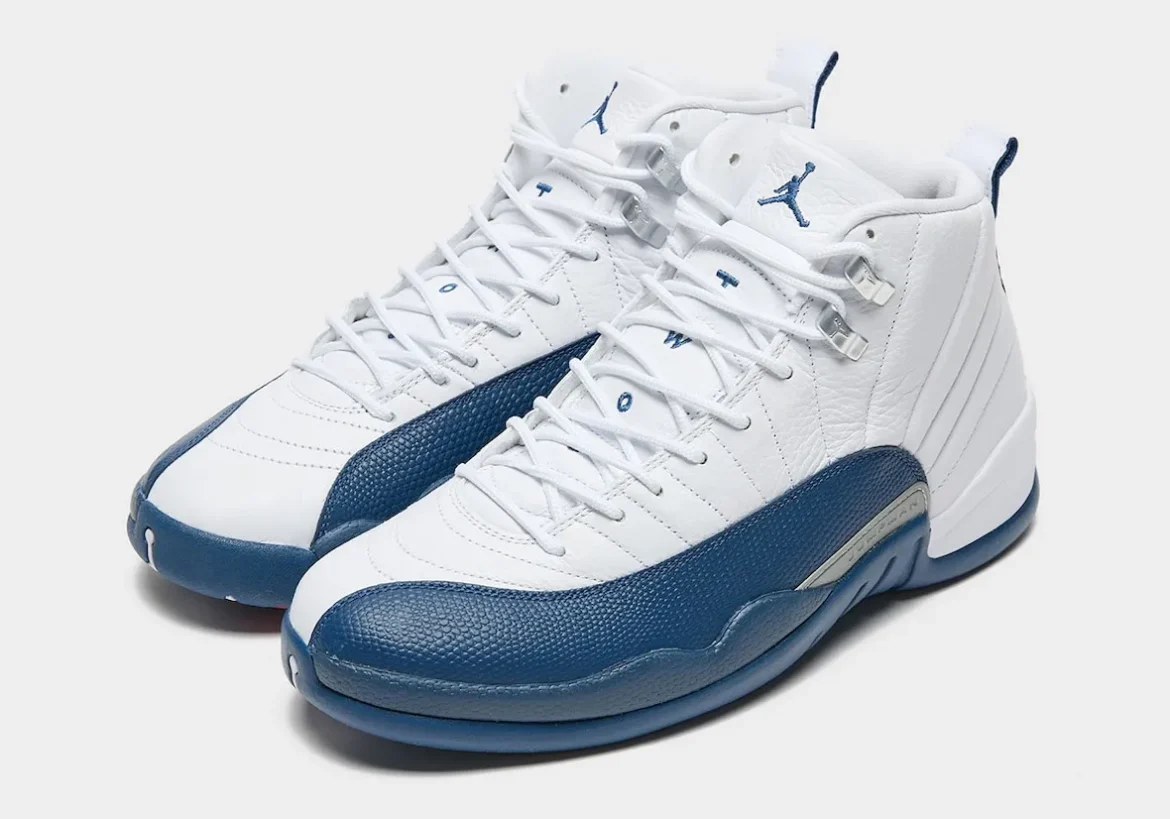 UPDATE 6/13/25: Official retailer images of the 2025 “French Blue” Jordan 12 sticks to its OG formula with a premium white leather upper, French Blue mudguard, Metallic Silver accents, and Varsity Red branding.