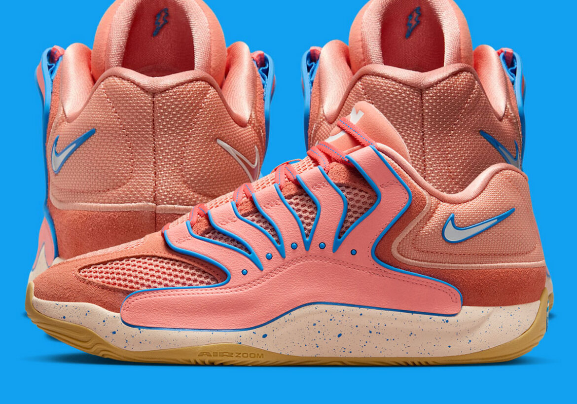 Yet a potential ode to where Kevin Durant rose to superstardom wouldn’t go very far in addressing the color combination here. Blending together “Atomic Pink/Light Wild Mango/Apricot Agate” in the upper pairs with an earthy counterpart in the gum sole, met by a midsole with blue speckles and a marble pattern within the circular cut-out at the heel.