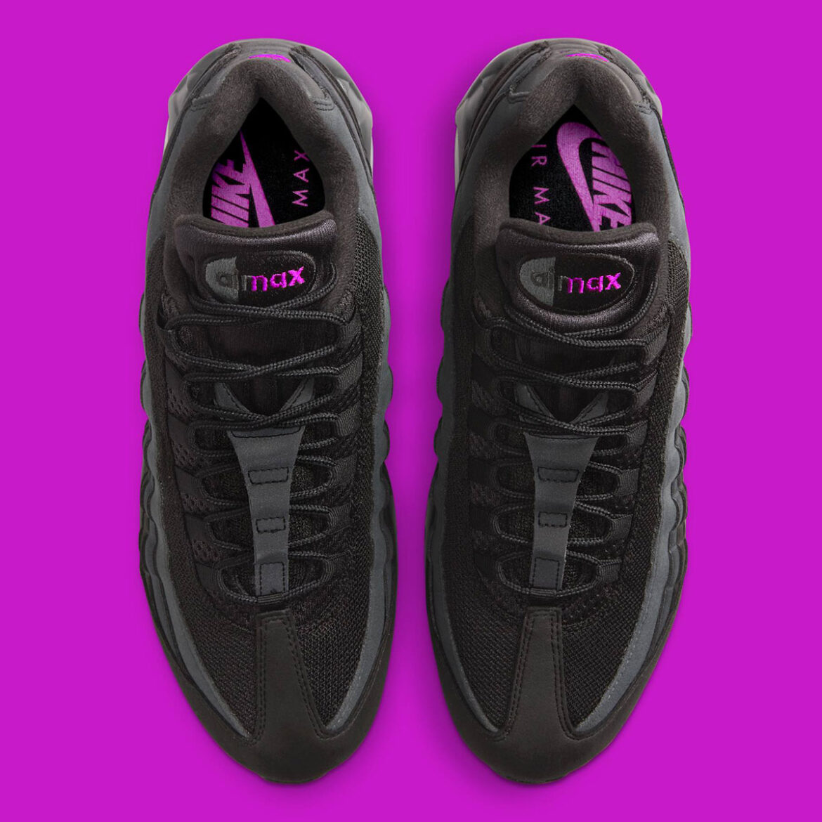 Eschewing the “Neon” style colorways that provided some of the splashiest looks for the “Big Bubble” silhouette, instead this 95 begins with a darkened overall profile. Pure black ironically gets the most shine, interrupted subtly by the midsole and the quarter panel gradient, tinting to light grey at the topmost “wave.” Where the ties from this old standard to the new chapter truly come into play are with neon purple accents at the extremes, painting the hi-vis shades on the Air Max logo on the tongue, Swoosh towards the heel, and Air Bubbles underfoot.