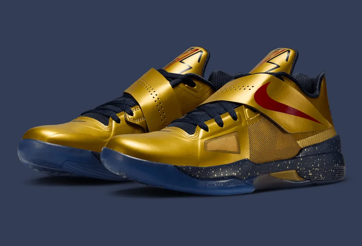 UPDATE 6/18/25: Official photos of the KD 4 “Gold Medal” have surfaced ahead of its Fall 2025 return. Featuring its iconic Metallic Gold upper, red Swooshes, and navy accents, this Olympic-themed classic is back with Zoom Air cushioning and the signature midfoot strap.