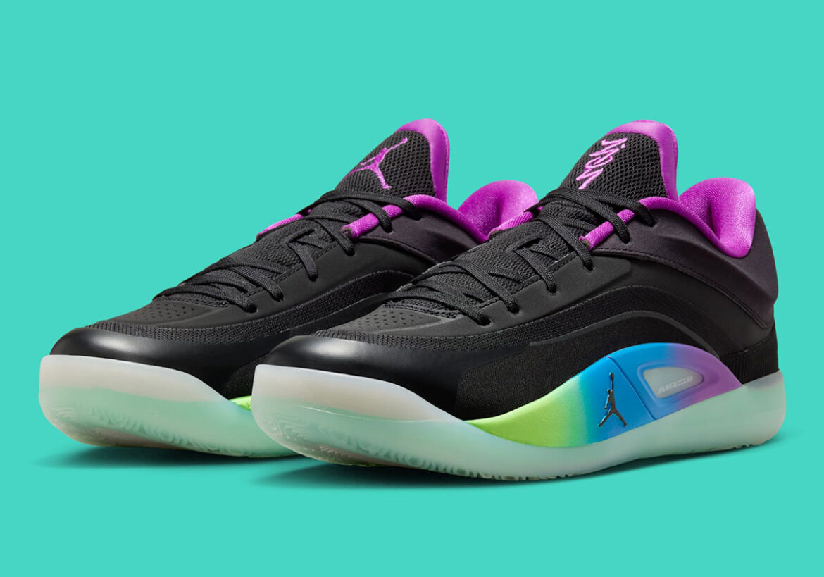Officially, the familial look was absent from the Zion 3, but the sparkling aura that Zion alludes to there is on full display with his latest model. A rainbow iridescent pattern paints the containment surrounding the full-length Air Zoom unit, mirrored with a bright purple sock-liner.