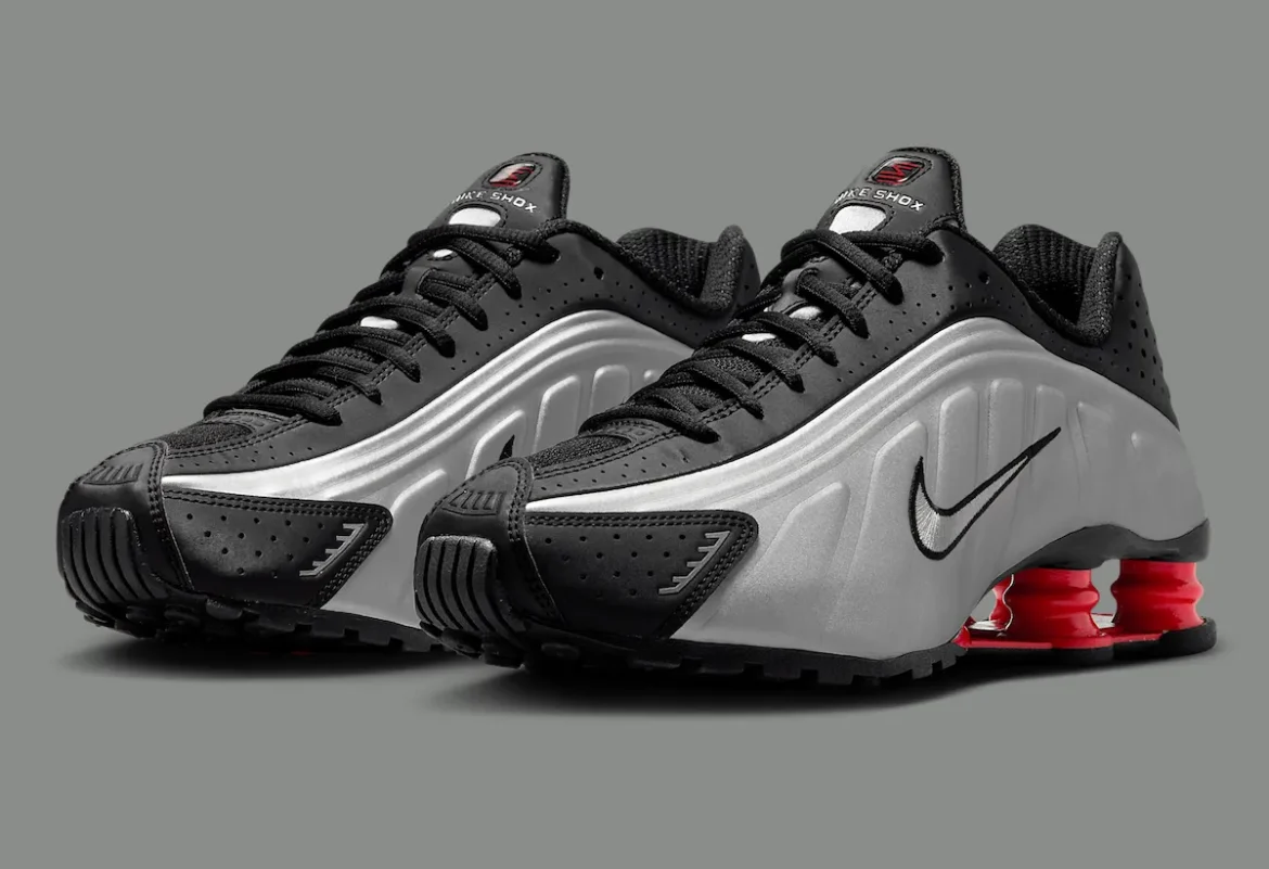 Originally launched in 2000, the Nike Shox R4 turned heads with its space-age design and spring-loaded cushioning. That wild red heel? Still here and still begging to be flexed on the ‘gram. This new drop features the iconic Black, Light Crimson, and Metallic Silver color combo. The upper shimmers like a spaceship and hugs your foot like a good ol’ 2000s hug.