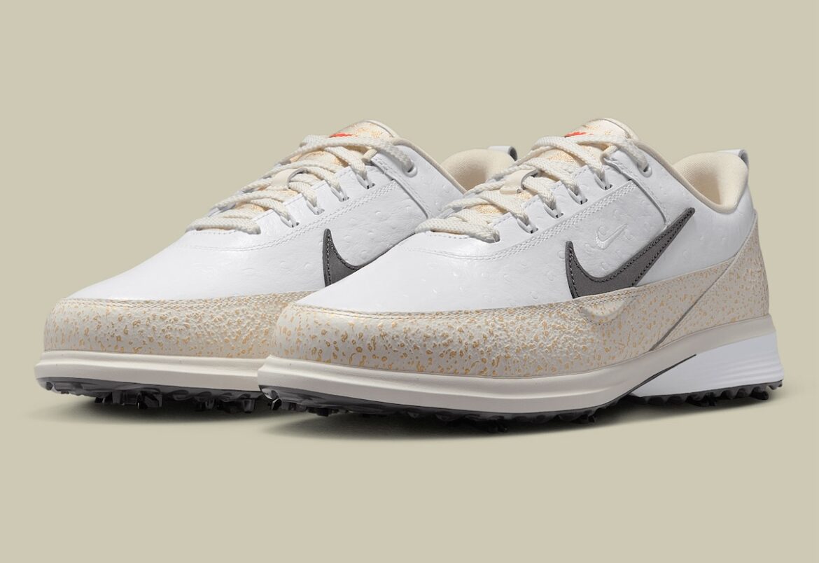 The Victory Tour 4 leads with a clean white faux ostrich leather upper. Its metallic gold mudguard brings flair to the fairway. A dark grey Swoosh dips into the gold, while a mini white Swoosh sits just above.