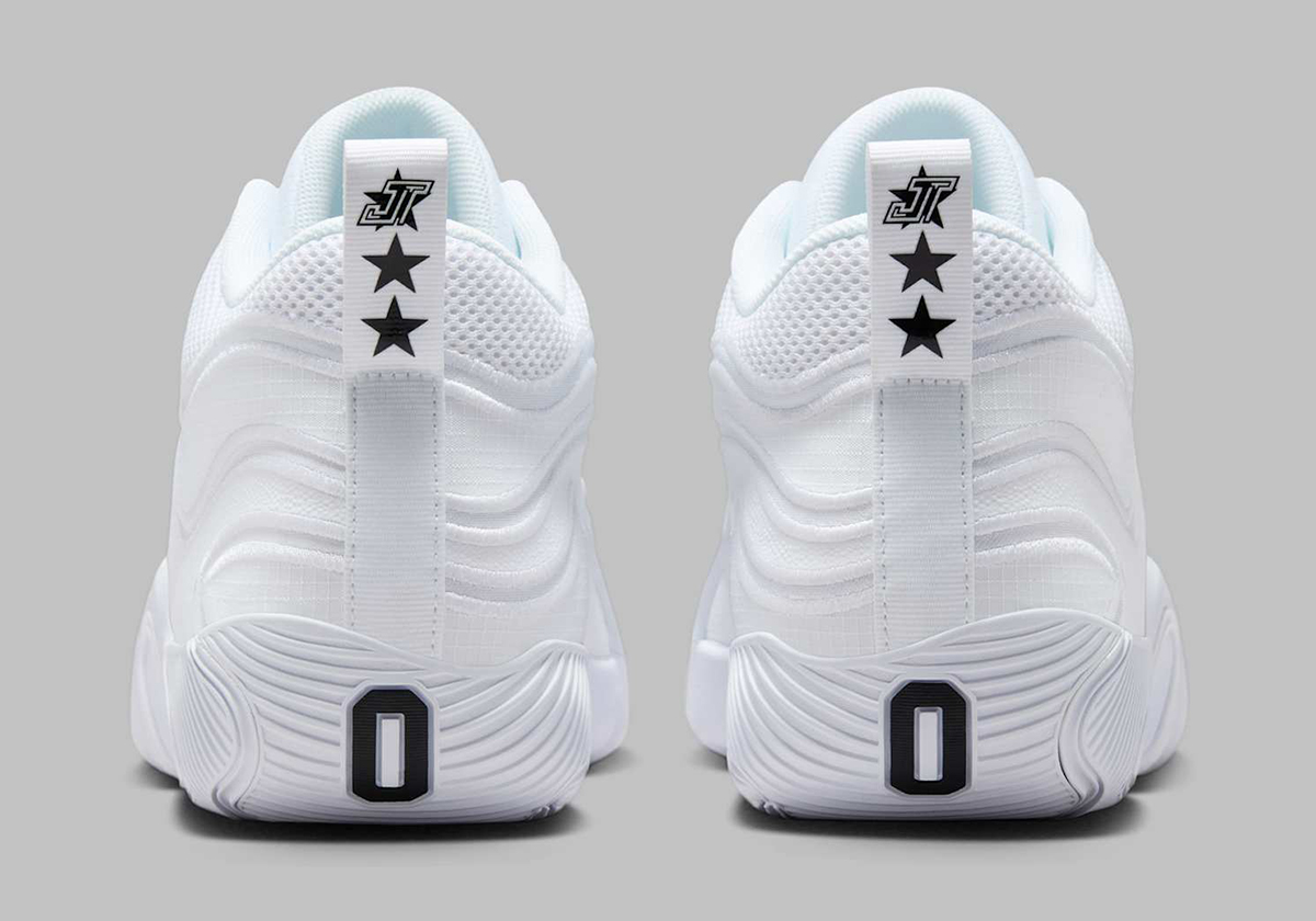 During this interregnum, one of the many challenges will be how to approach the Jordan Tatum 4 without the usual chance to debut the silhouette on court. We likely won’t see the brand’s answer to that question until Q4 2025, leaving the Jumpman to sort through Summer options in the meantime. In that regard, the Jordan Tatum 3 “White/Black” featured here is a perfect seasonal offering, going a bit further than the previous “Tunnel Walk” in embracing simplistic, whitened aesthetics. So much so, there’s a chance that this is the start of a “Team Bank” collection, but the never-before-seen stack of three pointed stars on the rear pull tab leaves the door open that this is indeed a more elevated mainline drop.