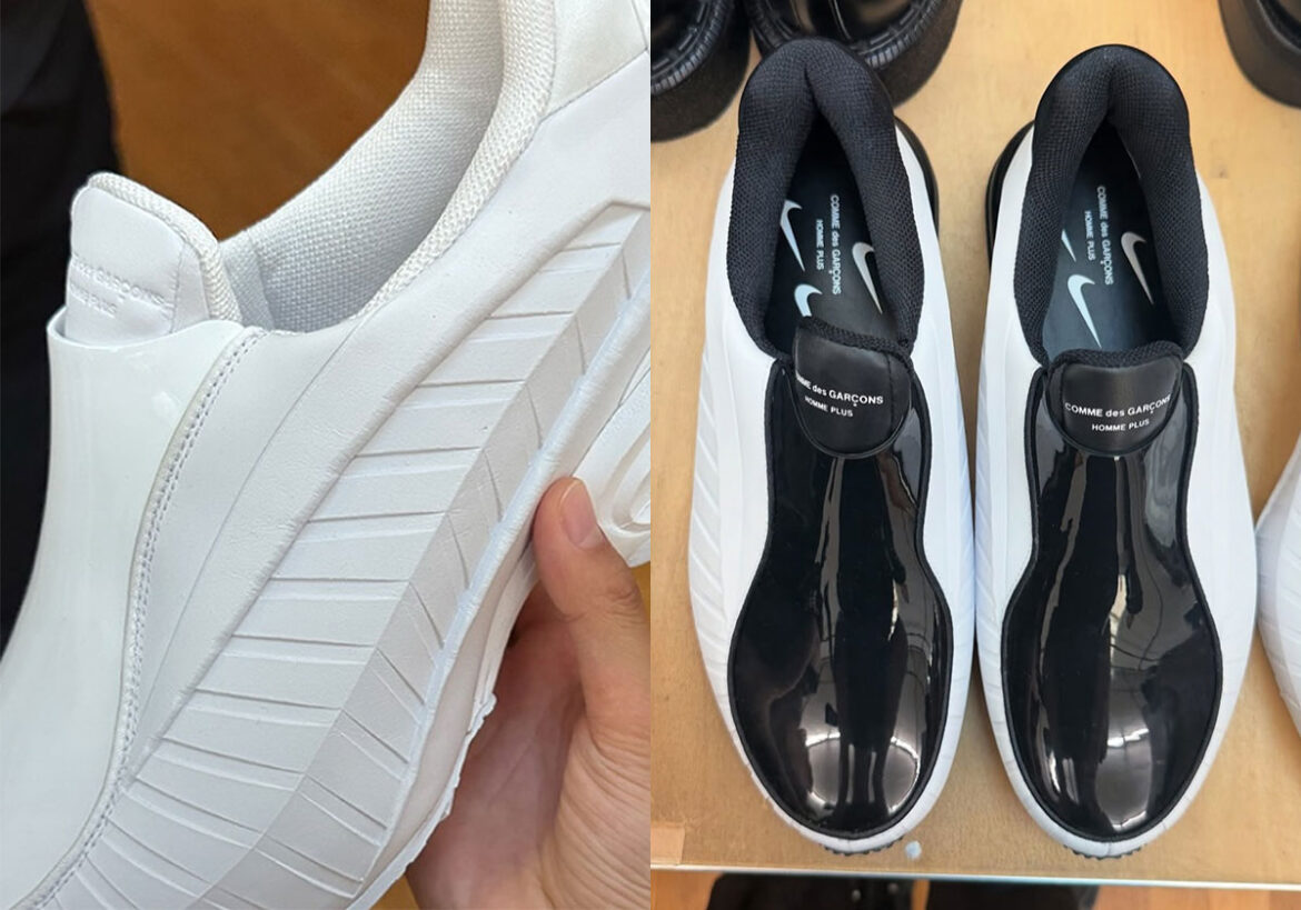 At Paris Fashion Week, Comme des Garçons HOMME Plus presented the first-ever retro release of the Air Max Dolce in its predictable presentations of all-white, all-black, and a blend of both. Images of the Air Max Dolce by the Japanese fashion imprint reveal the matted Air units at the heel without the OG seam and possibly without the caged housing on the medial side. A newly inserted patent leather shroud covers the laces, while the rest of the upper design, marked by chiseled ridges in a foam molded upper, appears fairly consistent with original (pictured below).