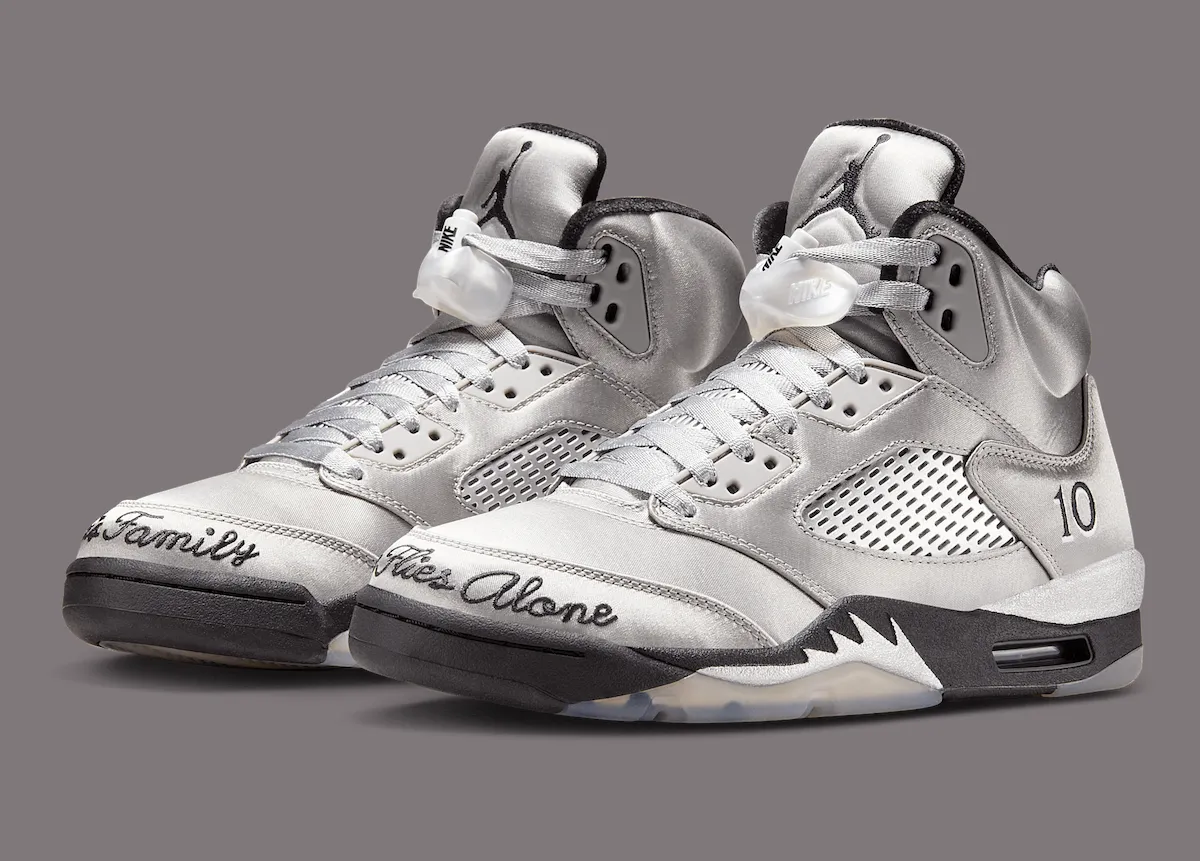 UPDATE 7/2/25: Official photos of the Air Jordan 5 Wings “10th Anniversary” reveal its sleek satin Silver upper and reflective mesh panels. Embroidered across the toes reads, “In This Family | No One Flies Alone.”