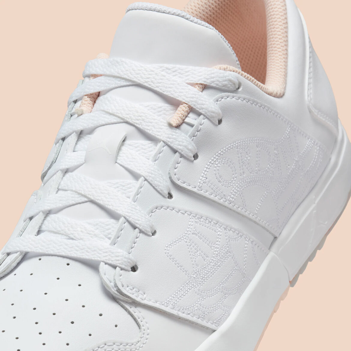 Delivering both the “Triple White” aesthetic that’s unavoidable in the Jumpman catalog and the identical white-on-white formula you’ll spot plenty in golf footwear, the layered panels of the Nu all wear the same icy shade. It’s in the very edges of the design where things begin to break away, pairing “Coral” collars with identically shaded traction underfoot, matte towards the forefoot and translucent below the heel.