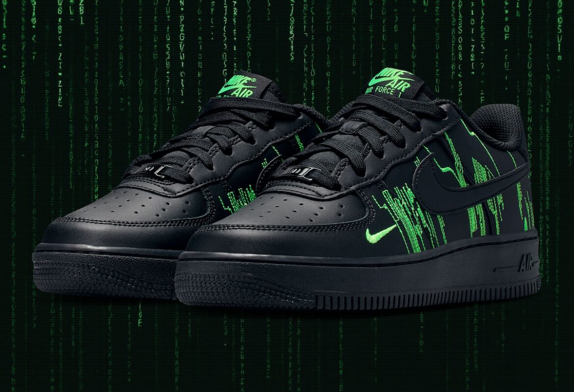 The Nike Air Force 1 Low GS “Matrix” is here to plug young sneakerheads into a digital dreamscape. Inspired by The Matrix, this all-black low-top features glitchy neon green graphics that look like they were hacked straight from a mainframe.