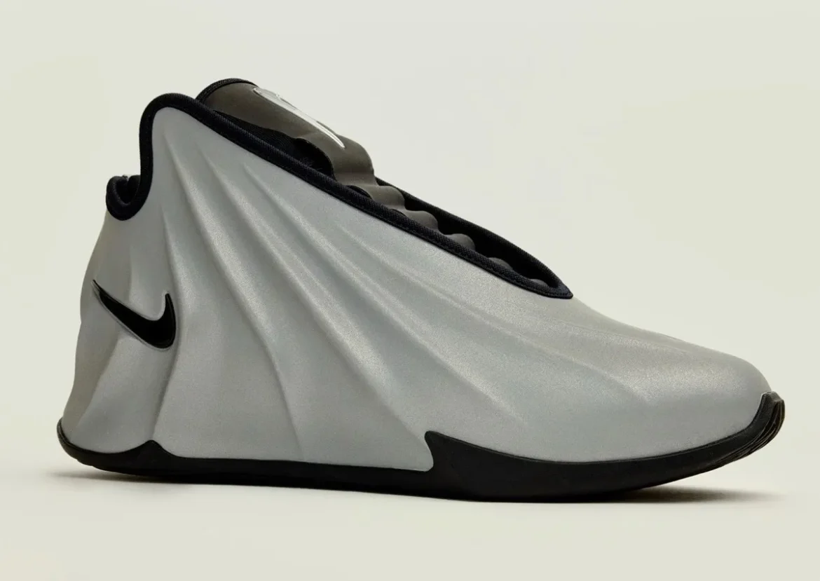 Revealed through the Nike SNKRS Showcase, the GT Future boasts a shimmering silver upper. The sculpted design flows like fabric, creating an aerodynamic feel. Subtle grooves and folds add depth and movement. A black neoprene collar and tongue offer a clean contrast, while a small Swoosh sits neatly on the heel.