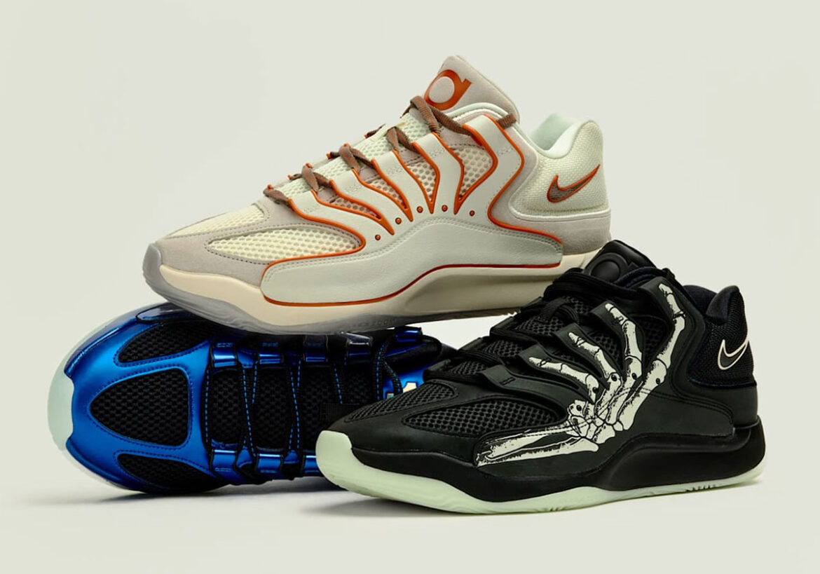 First up, Nike unveils the Nike KD 18 “Halloween” themed after the late-October holiday. It features an all-black upper with images of a skeletal hand, with each vestige lining up with the mid-foot overlay. Adding to the creepy themes is the glow-in-the-dark bottoms, a standard detail on Halloween-inspired Nike footwear. These are expected to drop this October.