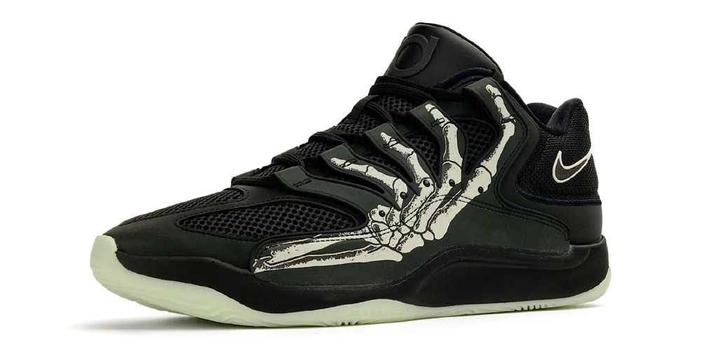 The “Halloween” KD 18 taps directly into Kevin Durant’s “Slim Reaper” persona, drawing inspiration from Nike’s popular “Skeleton” Air Force 1 series. The shoe features a predominantly black mesh and synthetic base, providing a dark canvas for its most striking detail: a pale, bone-like skeletal hand graphic that wraps dramatically from the forefoot to the heel across the upper. This eerie visual mimics X-ray designs seen in previous holiday drops, transforming the sneaker into a wearable piece of anatomical art. Adding to the spooky vibes, the design incorporates a glow-in-the-dark outsole, ensuring that its haunting aesthetic stands out in low light. The Nike Swoosh is subtly outlined in white on the collar, while KD’s logo blends seamlessly into the all-black tongue, maintaining a sleek yet thematic look. The aesthetic also reportedly draws inspiration from the rugged design of the Nike Terra Humara trail runner, blending Nike nostalgia with Durant’s contemporary taste.