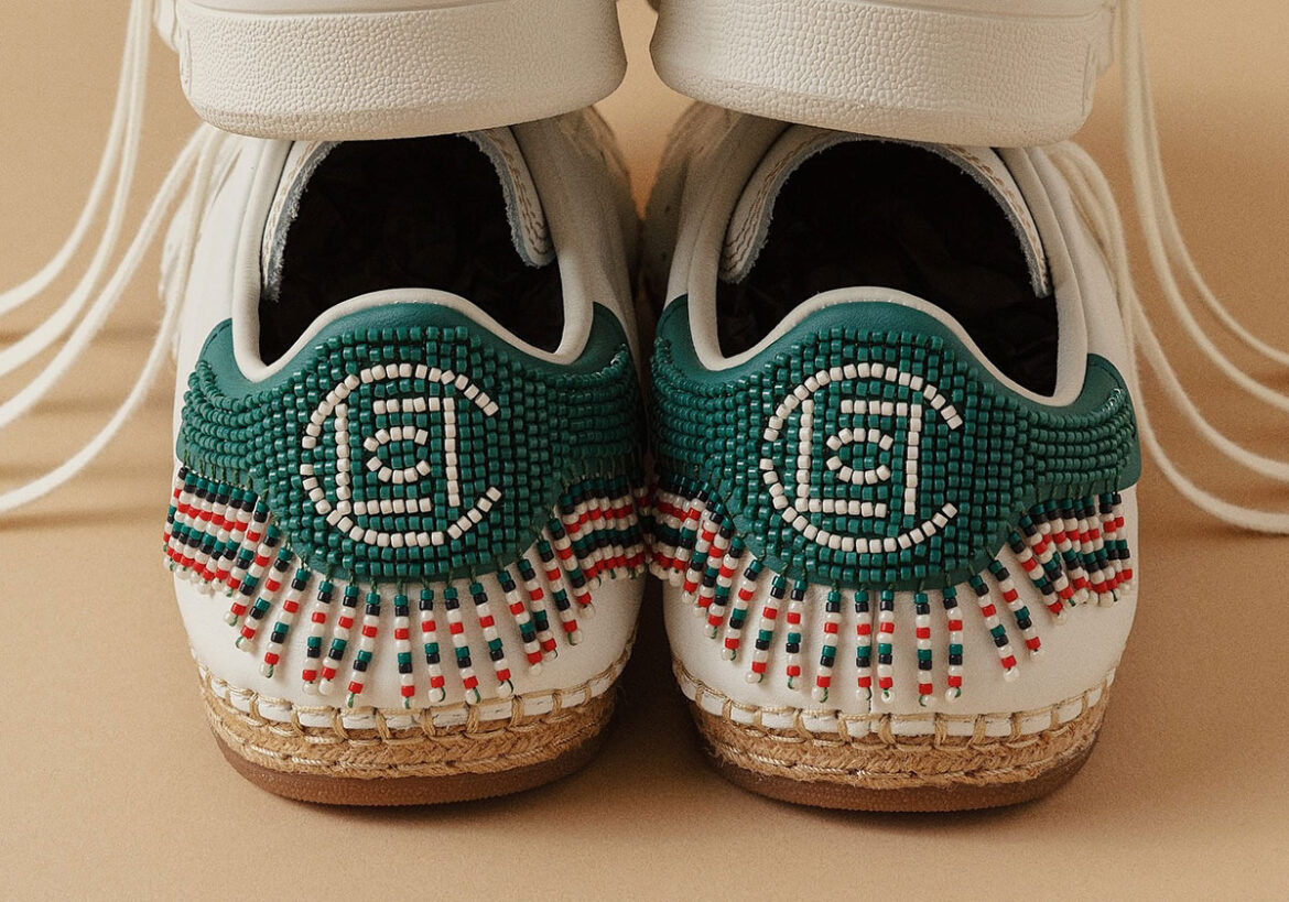 While the general public will get a chance to scoop pieces from the capsule on July 12th, an unexpected source just provided an early and potentially exclusive chance at another puzzle piece. Rather than just posting the beaded Stan Smith in navy or one of the green-on-tone Espadrille versions, Packer Shoes has let loose a yet-unseen Stan Smith that wears both. Additionally, the beaded heel cup wears extra co-branding punch, displaying the CLOT monogram within that section. The same leather quality, toebox lettering, and timeless white and green palette that defines the capsule otherwise remains in place.