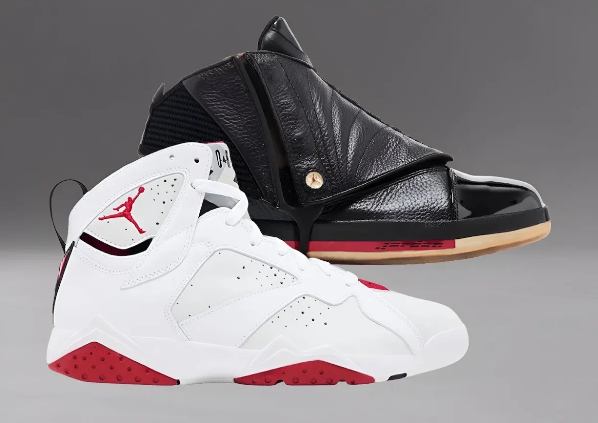 The Air Jordan 16 “Bred” made its first-ever retro appearance in this set. It features a black tumbled leather upper, patent leather toe, and a removable lace shroud. Red accents sit on the outsole, adding contrast to the all-black look. It brought back a fan-favorite performance model in true form.