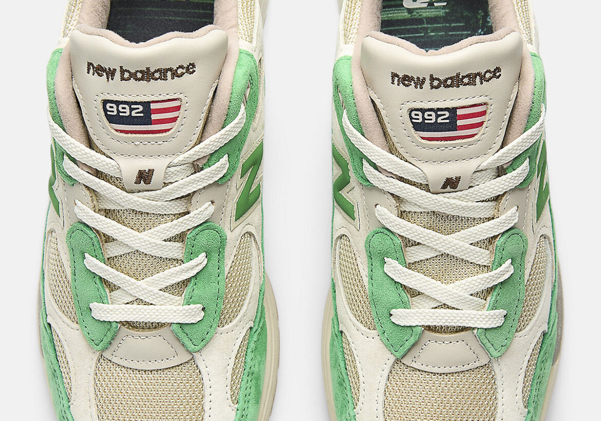 Here we have a first look at a 992 in a refreshing new colorway for the Fall 2025 season. Immediately, we’re met with an actual red/white/blue hit on the Made In USA flag on the tongue, while the rest of shoe’s build inclines towards the timeless retro runner look with suede overlays in a cooling green above a contrasting creamy tan quarter and base mesh. Beneath it all is a gum sole, with translucent Abzorb pods at the forefoot and heel to persist the performance tech of this once prized running shoe.