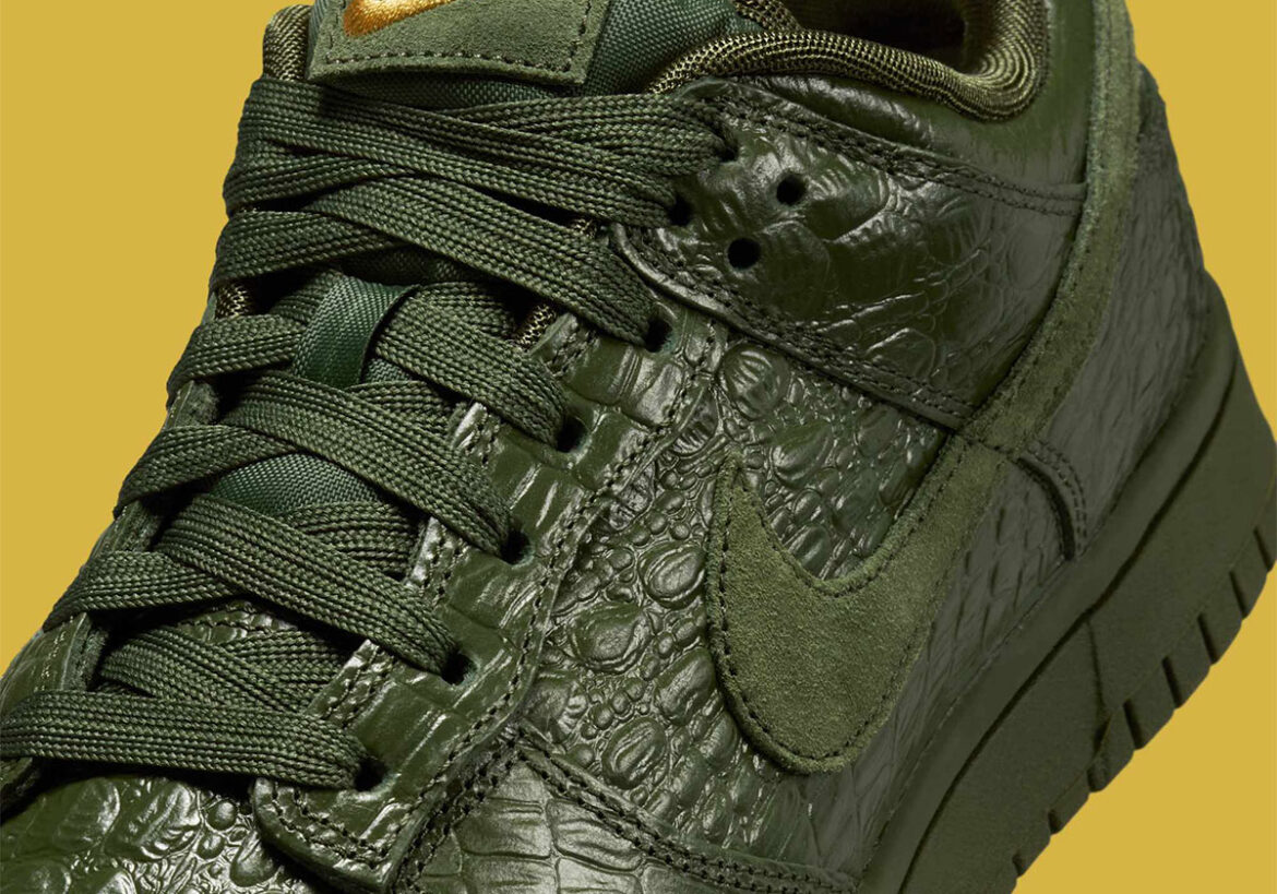 The animal instinct of the Nike Dunk has been one of its strongest suits to dates, taking to patterns, prints, and textures quite regularly throughout the decades. Croc-skin leathers and adjacent exotics are often tied to luxury goods, but there’s something quite down and dirty about this upcoming “Carbon Green” colorway.