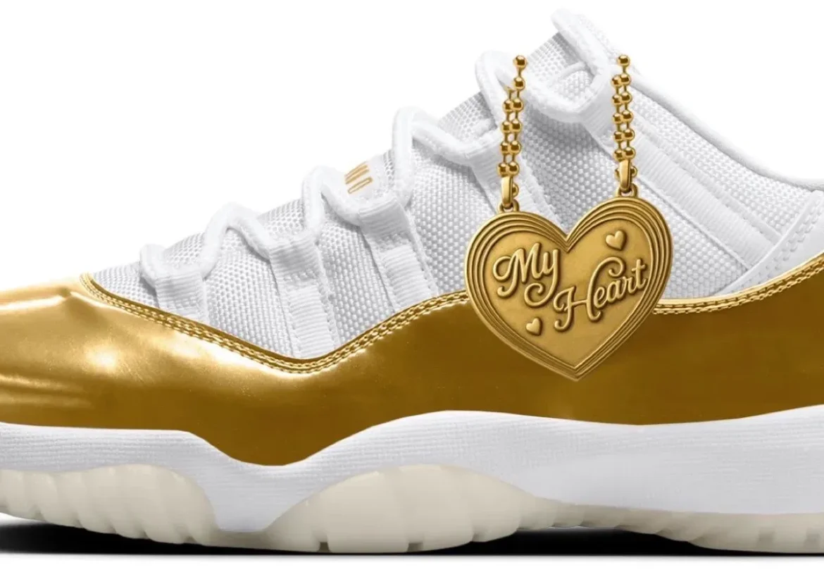 This special edition features a clean White and Metallic Gold color scheme and introduces a bold new detail: a gold heart-shaped pendant that hangs from the laces. Nicknamed “shoelery,” the charm reads “My Heart” and includes small engraved hearts, giving the shoe a personalized, sentimental feel.
