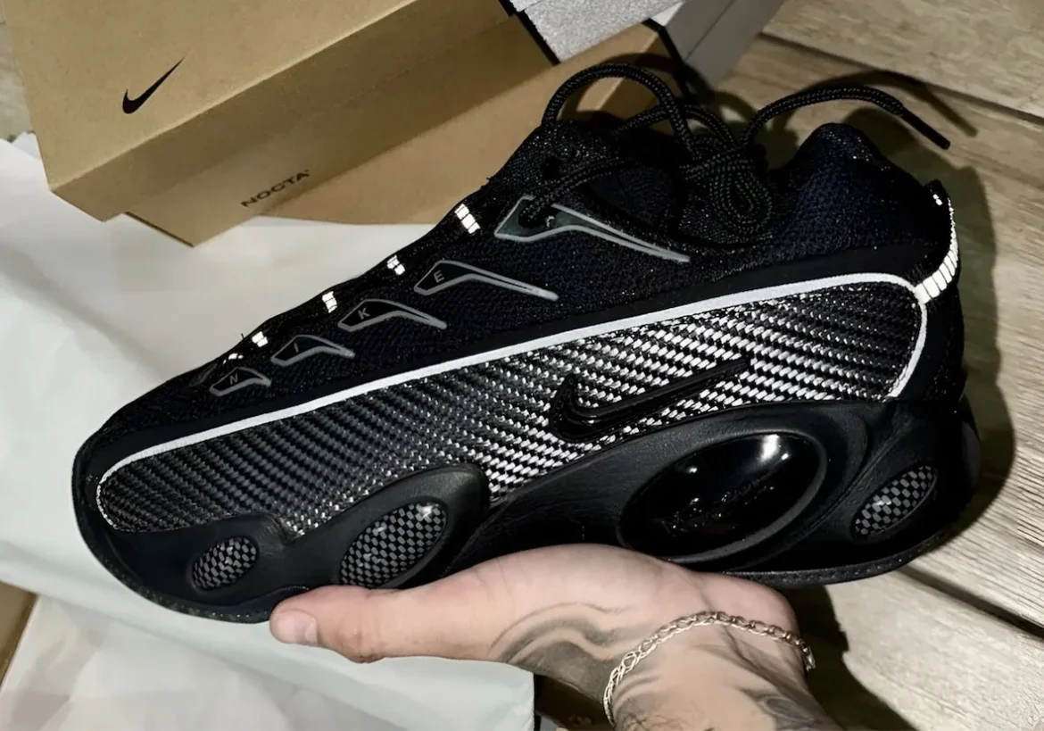 The upper features breathable black mesh layered with woven textile panels. Sounds fancy, because it is. Reflective 3M accents give it that “look-at-me-but-don’t” energy. Oh, and NOCTA branding? It’s there. Plus, the eyelets literally spell N-I-K-E, in case you forget who’s paying the bills.