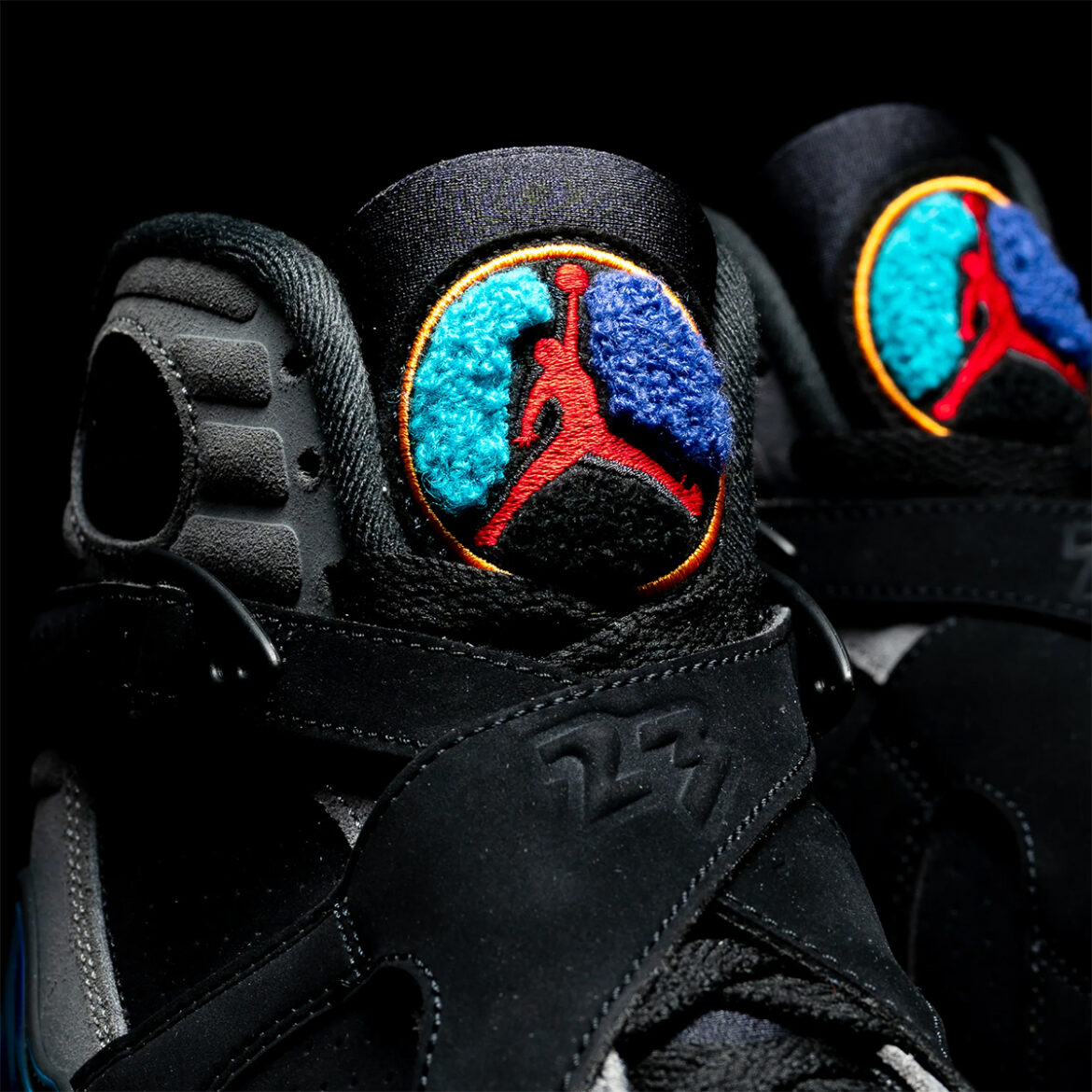 The standout feature on the Aqua 8s remains the brushstroke pattern that takes over the outsole and mudguard panel, an expression of the blue/purple split that gives this edition its name. The same tonality bridges onto the tufted chenille Jordan logo, split into three equal sections by a fiery central Jumpman logo. Though comfortably seated in the historical Jordan canon buoyed by his on-court performances, this is a colorway the GOAT never paired with a Bulls uniform. Bygone uniform restrictions kept him to the “Bugs Bunny” and “Playoffs” during regular and postseason action; only allowing him to lace ’em up for the 1993 NBA All-Star Game.