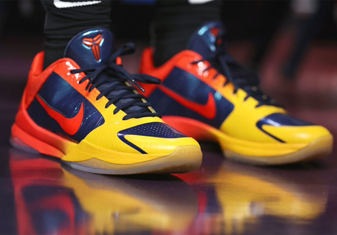 Unlike the retail pair that dropped in late June, this Kobe 5 PE achieves more contrast via the color-blocking. The same Indiana navy blue is featured on the base, while the overlay features a fiery gradient fade with yellow at the toe eventually blending into orange at the heel.