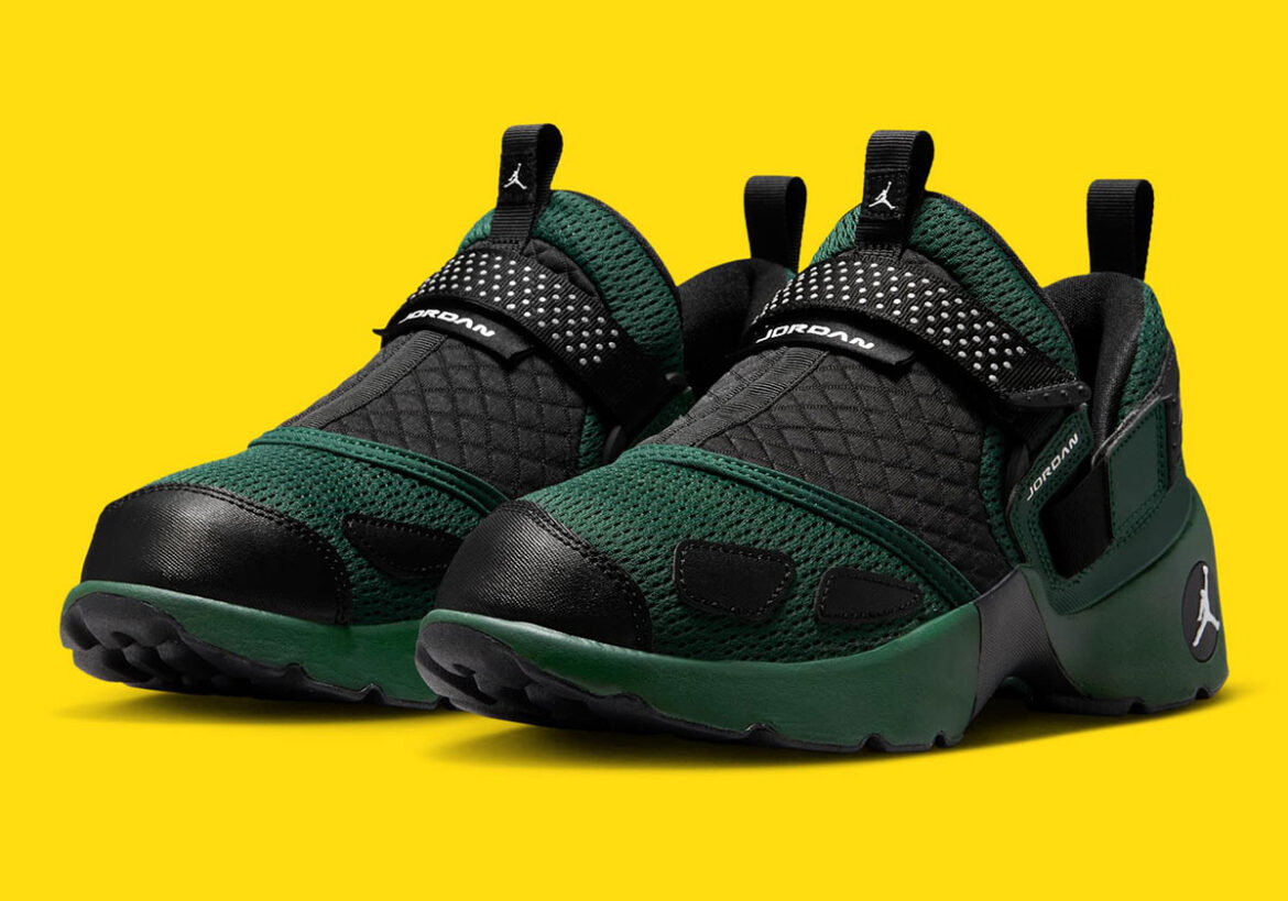 Born in the early 2000s as an edgy, all-purpose training/running shoe hybrid for top athletes across all sports, the Trunner LX has seen new life in 2025 as women’s lifestyle model that checks off that “tech runner” aesthetic. However, the standard silver overlays and white mesh commonly associated with that trend has eluded this classic model; instead, the Jumpman has been touching the icon with more lifestyle focused works like this green/black colorway.