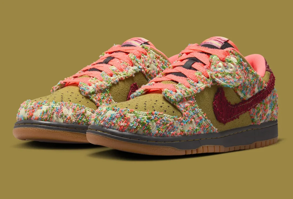 Nike has revealed one of the upcoming colorways in the Dunk’s “Panda Monium” collection, which is an “erratic pack” that will feature mystery-box style releases. The Nike Dunk Low “Green Curry” is a green, multicolor, boucle-embellished Dunk Low that brings maximalist textures and new life to the retro silhouette.
