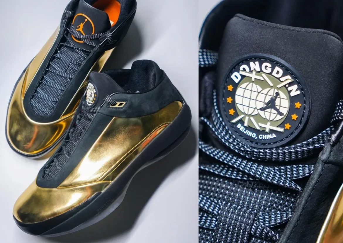 Shared by @oklai19, the sneaker boasts a shiny metallic gold upper, deep black suede overlays and reflective ZoomX cushioning. One tongue is adorned with a vivid orange Jumpman, while the other showcases the Dongdan tournament logo. This clever detail is a reminder that Beijing’s summer hoops showcase is world-renowned.