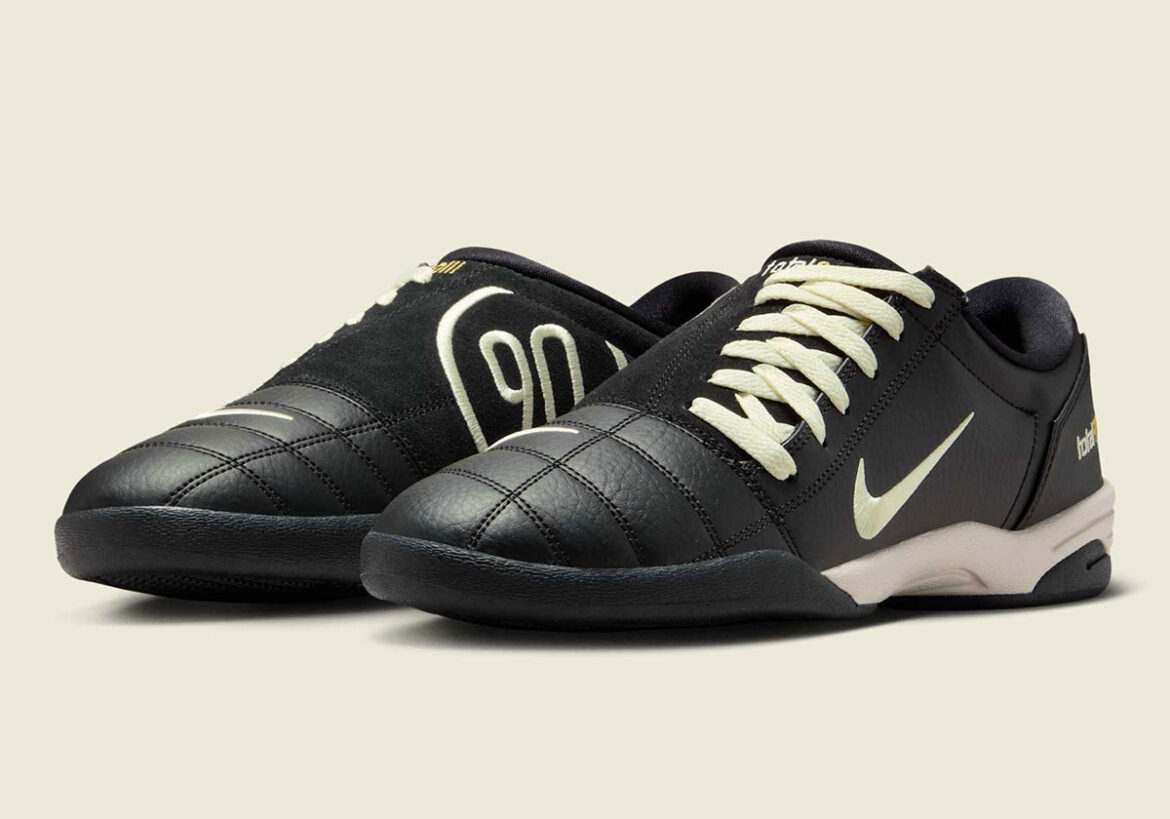 While the “Fir” and “Pearl White” Total 90s achieve a vintage aesthetic through heavy distressing, these go a different, more subtle route. Tumbled matte leather replaces the glossy finish of most releases, and the medial side features a texture swap to suede. Nike’s off-white “Sail” hue mimics the effects of aging on the midsole, laces, and branded elements, while the rest of the design keeps things low-key in black. The end result is a sneaker that’s less Y2K and more 1970s/80s; a more solid option for those who value versatility over flair.