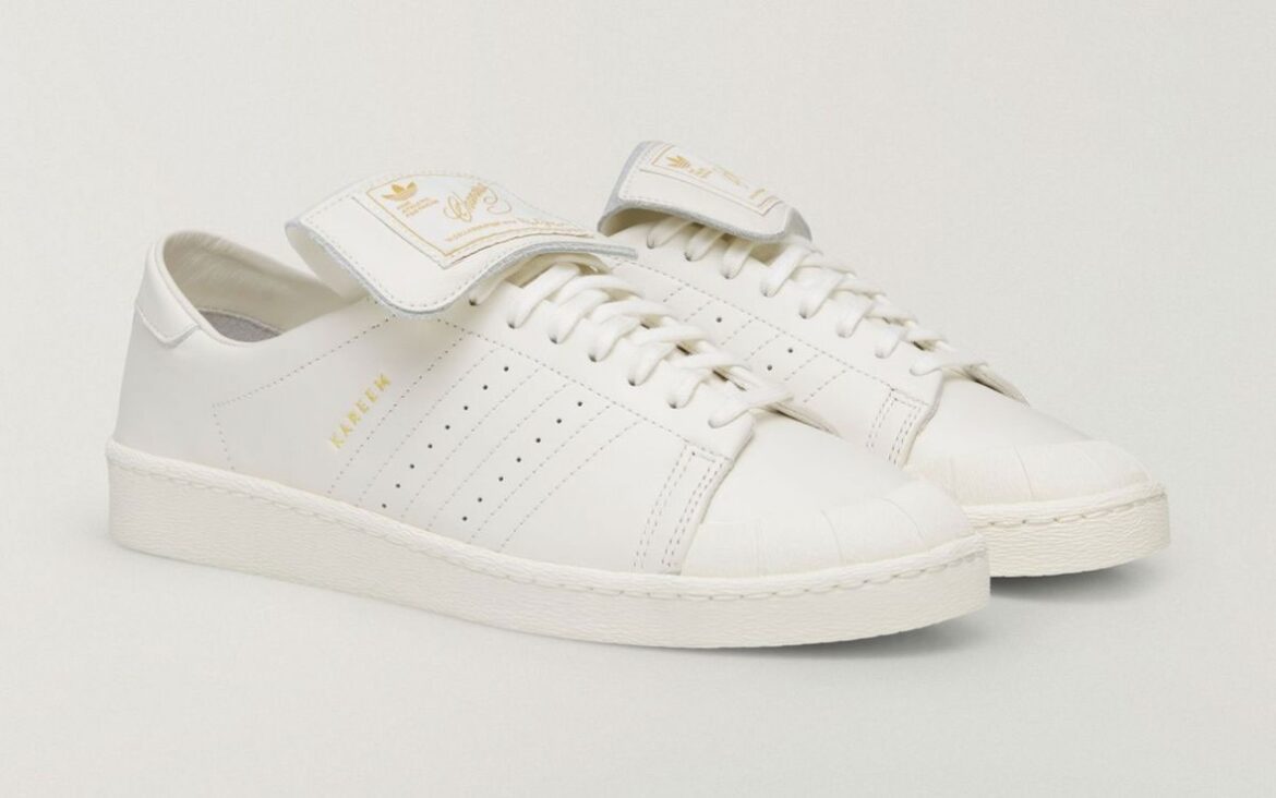 Minimal design elements anchor the pair. An off-white leather upper is complemented by a matching sole and soft grey collar trim. An elongated tongue (a signature of Chavarria’s work) has gold stamping for the adidas logo and Willy Chavarria branding. On the side, “Kareem” is emblazoned in gold foil to pay tribute to the original basketball player.