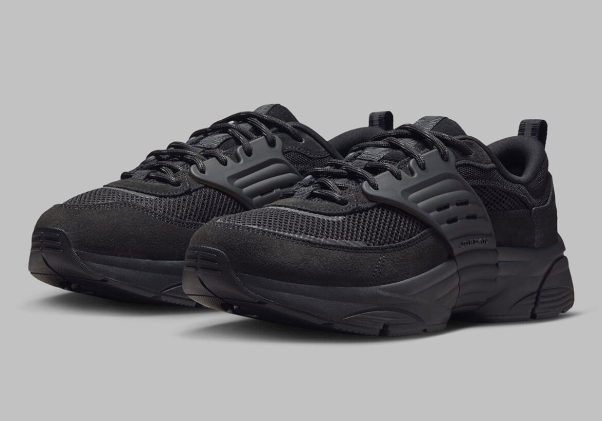 As promised by that title, there’s nary a divergence from jet black in this design, constant through the mesh foundation, suede and leather mudguards, the TPU cage, and the layered midsole composition underfoot. As we noted in our coverage of the Jordan Trunner O/S “Infrared,” the few looks we got at the modern formulation before leaned on multicolor fare, but that shoe and the one at hand instead deliver monochromatic fare, setting up two distinct aesthetic flanks as the model nears debut.