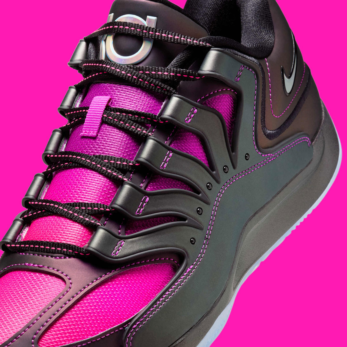 To pull back the mystery, it would appear that Durant and the design team are embarking on a few homages to the Nike Air Foamposite One, linking the perennial All-Star and the tanky model’s DMV ties together. The most recent SNKRS Showcase revealed a shining edition in “International Blue” that evokes the “Royal,” while the one at hand bears real resemblance to the equally totemic “Eggplant.” On top of the shades deployed here, the shimmering sidewalls and icy sole underfoot touch on the original design, with a divergent flourish coming via the gradient mesh contained within.