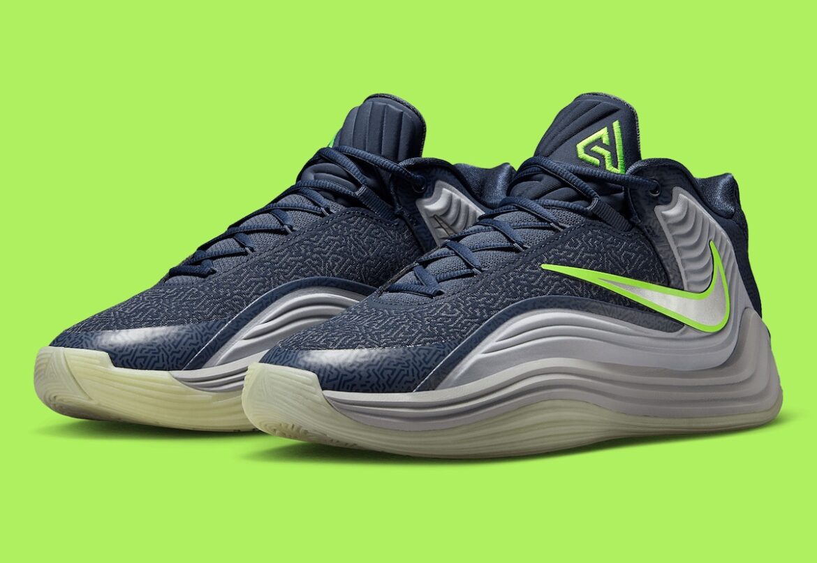 The sculpted metallic Swoosh outlined in volt green is a standout highlight up top on the lateral side. Giannis Antetokounmpo’s signature embroidered logo takes the tongue treatment in neon.