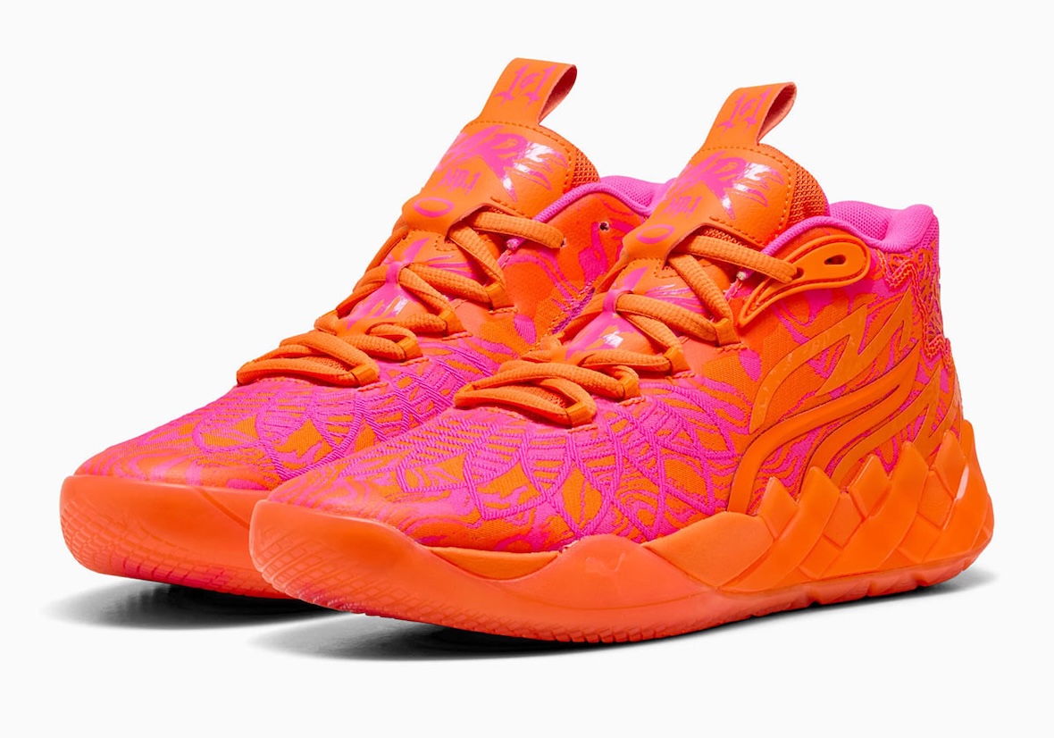 Splashed with an eye-catching mix of orange and fuchsia, the PUMA MB.01 “Mash Up” celebrates the high-energy style of LaMelo Ball. Available August 8, 2025, the latest Ball-designed sneaker from PUMA continues the “Not From Here” theme of previous MB.01s.