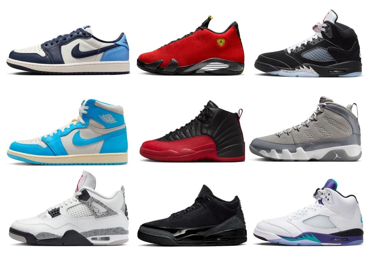 Completing the lineup is the Air Jordan 9 “Cool Grey”, Air Jordan 1 Low “University Blue/Navy”, and the fan-favorite Air Jordan 5 “Grape”.