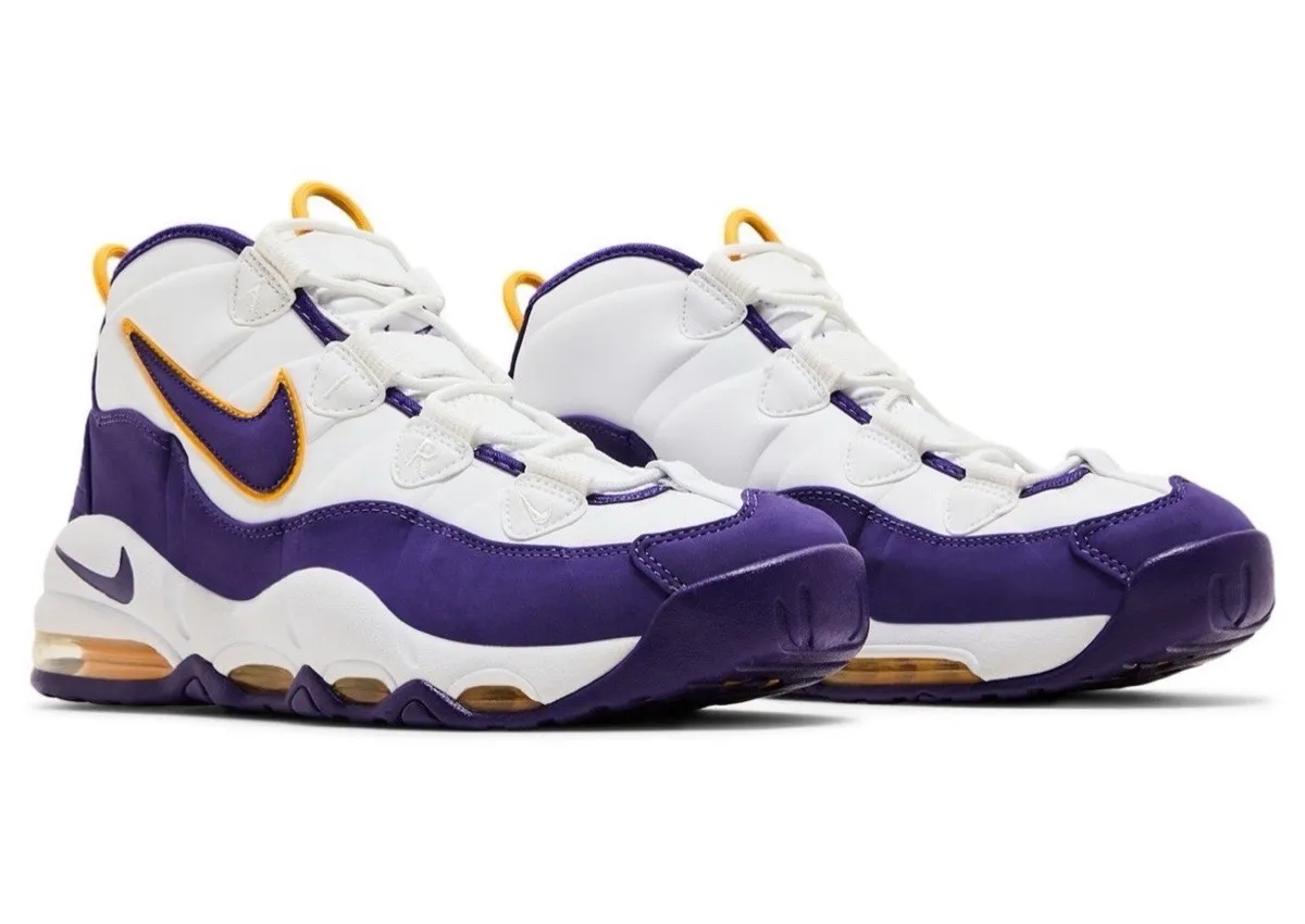 The Nike Air Max Uptempo “Derek Fisher” is presented in a white, varsity purple, and gold colorway. White leather is accented with purple nubuck overlays and yellow piping around the oversized Swoosh. The accents are found on the lace loops, heel pull tab, and on the perimeter of the outsole as well. The combination is an instant lookback to the purple and gold era of the Lakers in the 2000s.
