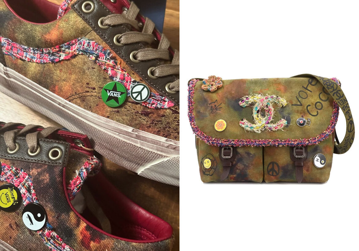 To peel back the narrative here for those who haven’t spotted these yet, the Vans Old Skool 36 “Souvenir” is a tacit yet rather bold reference to the “Graffiti” Chanel On The Pavement Messenger bag. True to that style, frayed multi-color embroidery drapes the sidestripe here, while its leather straps and buckles inspire the toe-cap, heel cup, liner, and eye-lets. Vans pints allude to the “summer of love” style patches on the OG, and serendipitously align with currently trending charm aesthetics.