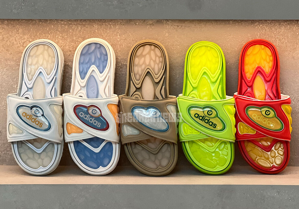 Confirmed to be scrapped samples with no plans of hitting retail, the Bad Bunny adidas Reptossage was created in five distinct colorways featuring the signature eye logo on the jelly logo on the mid-foot strap, and the addition of oblong shapes on the medial and lateral slide. Both of those features replaced the Performance logo that once sat in those areas. The jellied cushion pods on the footbed remain consistent with the actual version, as do the grooves that line the sidewalls of the sole.