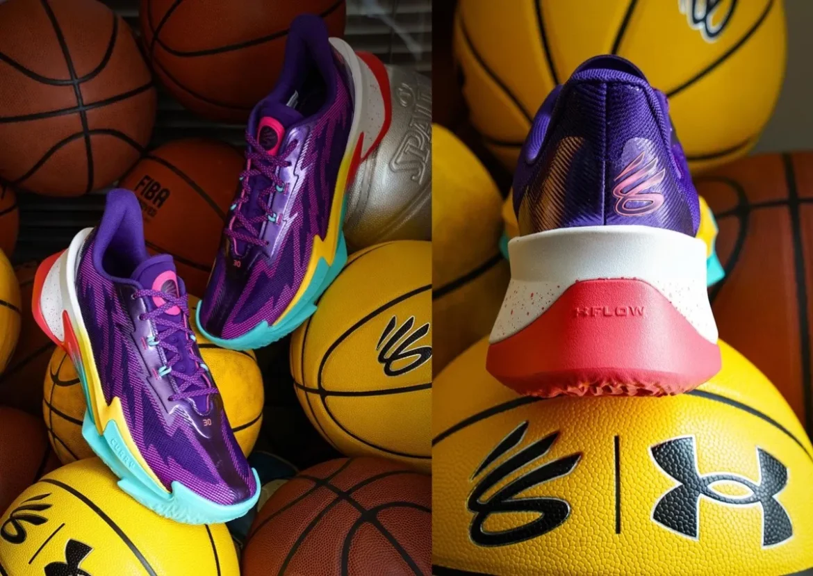 This release is decked out in a royal purple base with turquoise, yellow, red, and pink accents that give it a feel of dynamism. The Curry Series 7 shares many hallmarks of a performance runner in its sculpted midsole, flared heel, propulsion plate and signature UA Flow outsole.