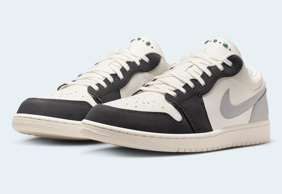 The “Turquoise Stone” theme returns this fall with a low-key, but luxurious take on the Air Jordan 1 Low. Dressed in Sail, Light Smoke Grey, and Black, the release focuses on clean color-blocking instead of showy details. A row of turquoise and pearl-like charms above the Jumpman logo ties it to the rest of the developing collection.
