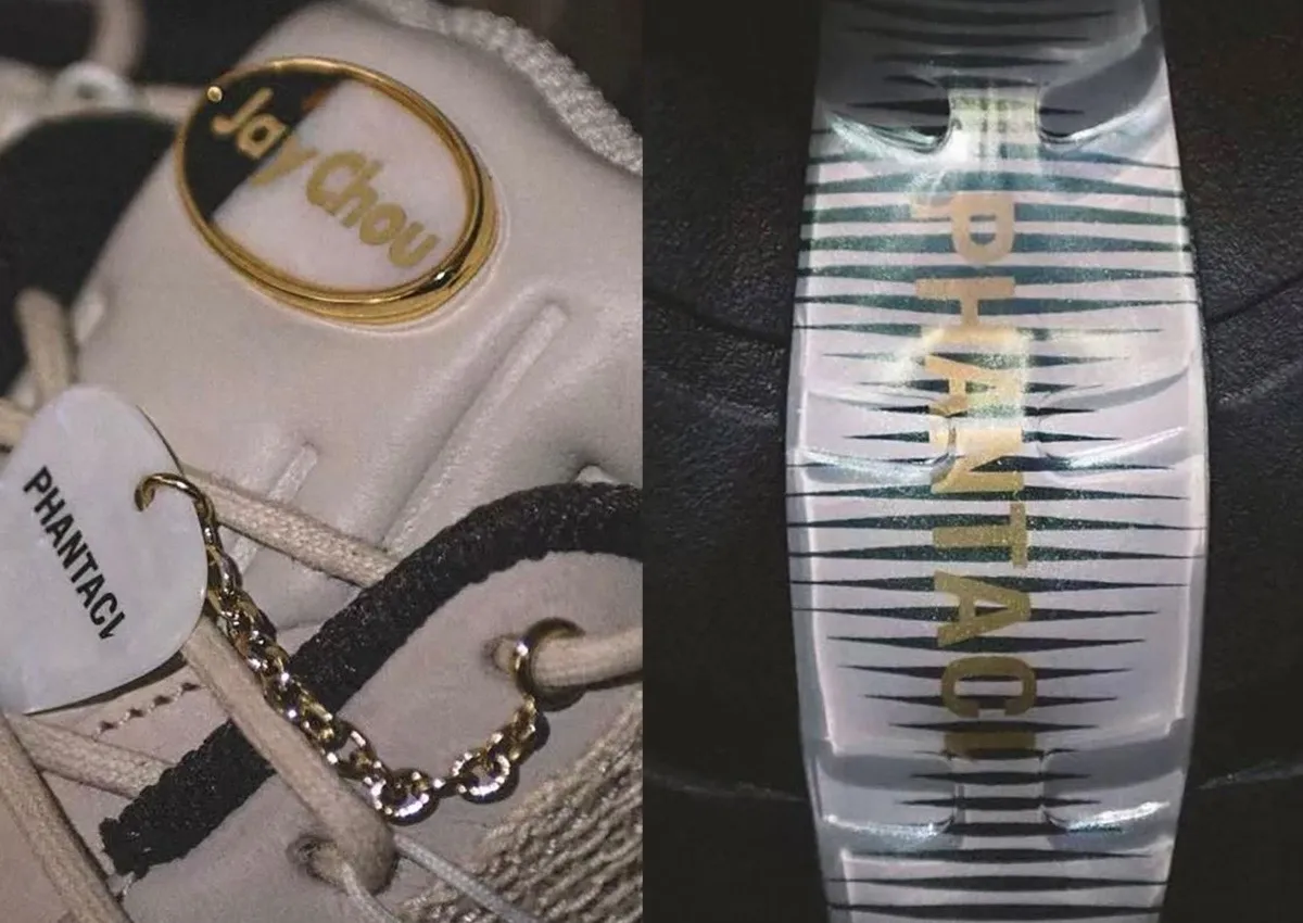 From the first images, there is an attachable PHANTACI guitar pick necklace on a gold chain, a pearloid Jay Chou tongue logo, and tortoiseshell accents that are familiar to any guitar enthusiast. Additional features on the shoe include multi-layered grey leather parts with gradient effects and a textured mesh covering for contrast. The heel tab also has gold “PHANTACI” lettering for the finishing touch.
