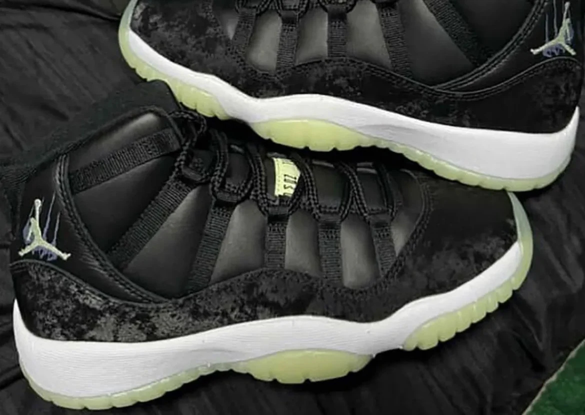 The shoe is wrapped in a refined Black upper that mixes together supple leather and premium velvet mudguards with a slight pattern for added interest. The neon green colorway is splashed on the tongue branding, heel Jumpman logo, and outsole which glows brightly in the dark. Below the Jumpman, three claw marks tear through the heel to match the box’s neon green claw graphic. The additions bring an extra level of spooky seasonal play to the design. A bright White midsole provides a crisp contrast, while a translucent green outsole leaves a bold colorful impression.