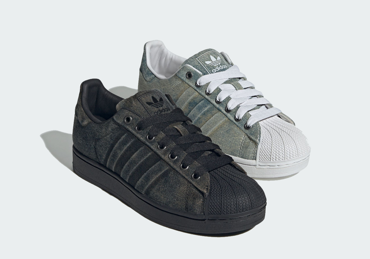Two contrasting applications are on task, beginning with a grungy all-black. Built atop the Superstar 82 composition, aimed at recreating the original Made in France layout, washed patterns overcome the hardned fabric, bringing it closer to a dark grey in select splotches through the profile. At the quarter, you’ll find the biggest structural shift outside of the titular fabric, as the Three Stripes poke from underneath for an embossed flair rather than the usual stitched, tangible presentation. The partnering pair largely keeps the same script intac but opts for a different color-up, wearing more traditional blue hues on its exteriror while opting for white counterplay within the liner, laces, shell toe, and sole.