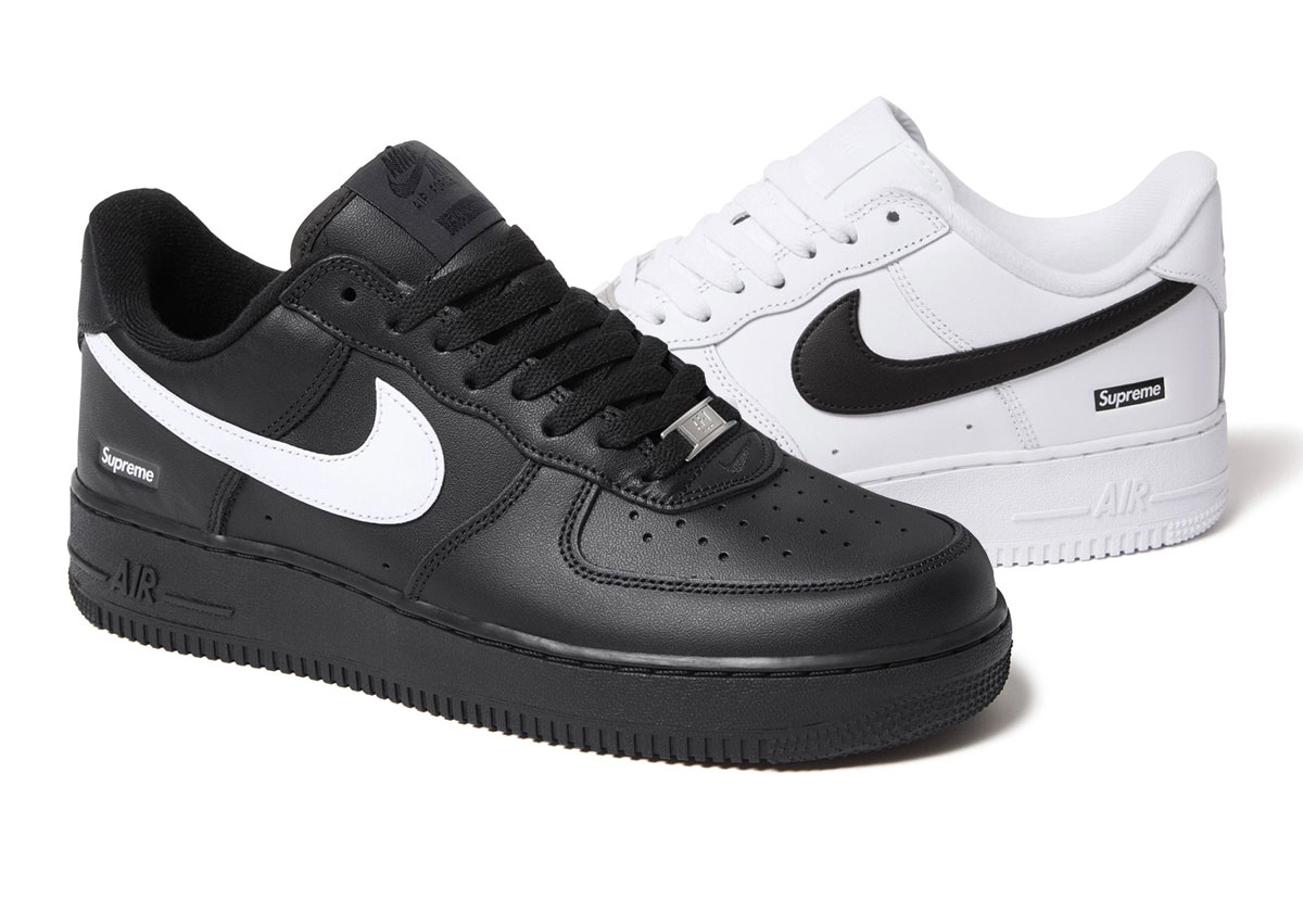 The all-white Supreme Air Force 1 from 2020 largely set the blueprint for the past five years, with nearly all subsequent Supreme AF1s being existing/simple colorways slapped with box logos. It’s an admittedly uncreative strategy, but as long as hypebeasts keep buying ’em, they’ll keep on coming. Here we have two colorways of that vein, one in black/white and another in white/black. Supreme box logos are debossed on the lateral side of the heel, complemented by co-branded tongue tags and extra laces featuring all-over Supreme text.