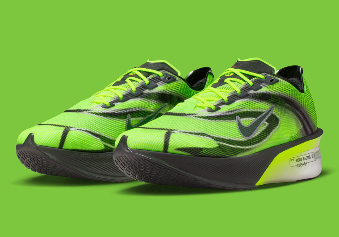 The Nike Vaporfly 4 “Ekiden” alludes to the Streak series with sharp, almost tribal-like black graphics over a lime green base, although no one specific model comes to mind. Japanese characters appear on the tongue, insoles, and spine, while the midsole features black paint up front and a green gradient at the rear.