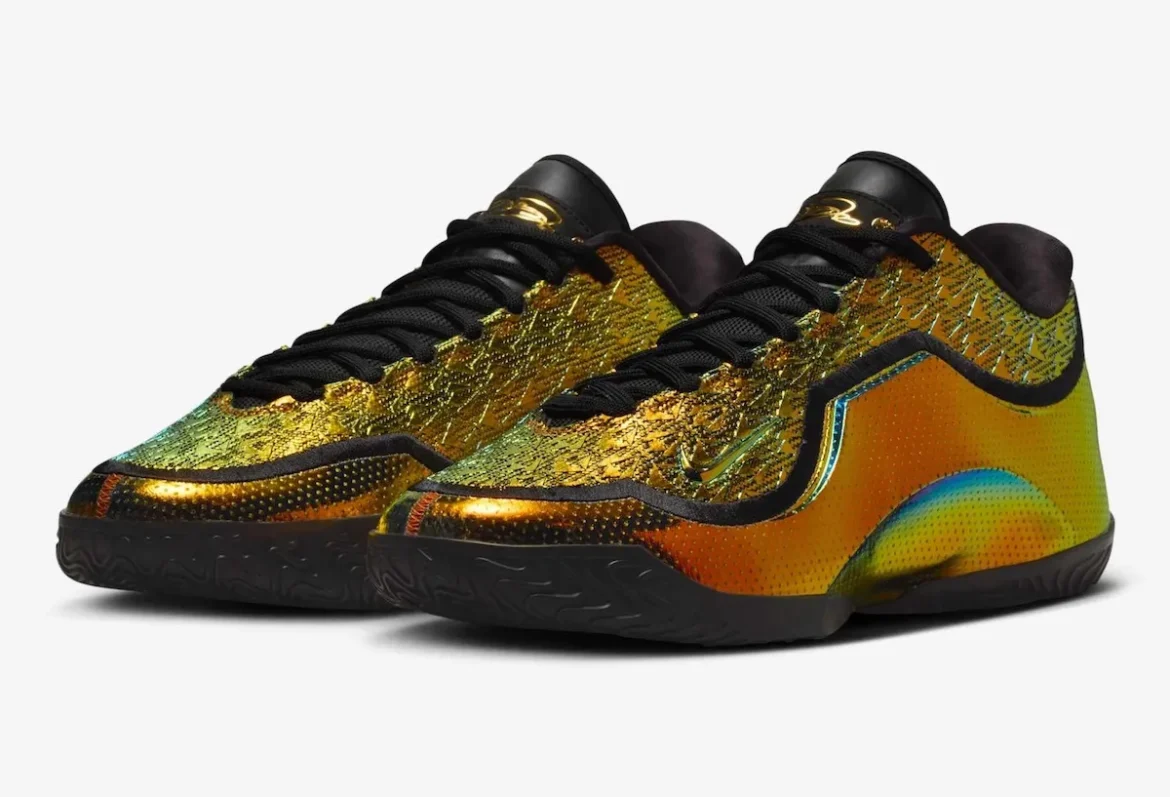 The upper features shiny textures and ornate patterns, with black accents added for contrast. Metallic mini-Swoosh and crown-shaped creases adorn the midsole, and the heel features “40K” lettering in a vintage currency style. The presentation also didn’t disappoint, with the release coming in premium packaging complete with iridescent accents, a special booklet detailing LeBron’s journey and commemorative accessories.