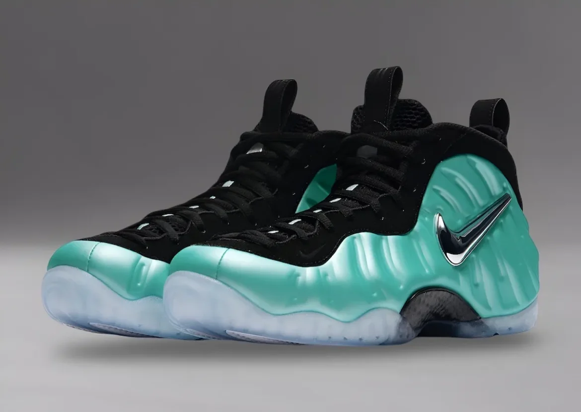 It sports a bright molded Foamposite shell in a reflective turquoise color, and a chrome jewel Swoosh along the side. Balancing black details on the eyestays, tongue and collar, and a carbon fiber midfoot shank for durability and support. The translucent icy outsole ties the sneaker together, looking cool in play and off the court. The pair is memorable for that pop of metallic that compliments the crisp clean aqua base. Foamposite fans still appreciate that level of detail.