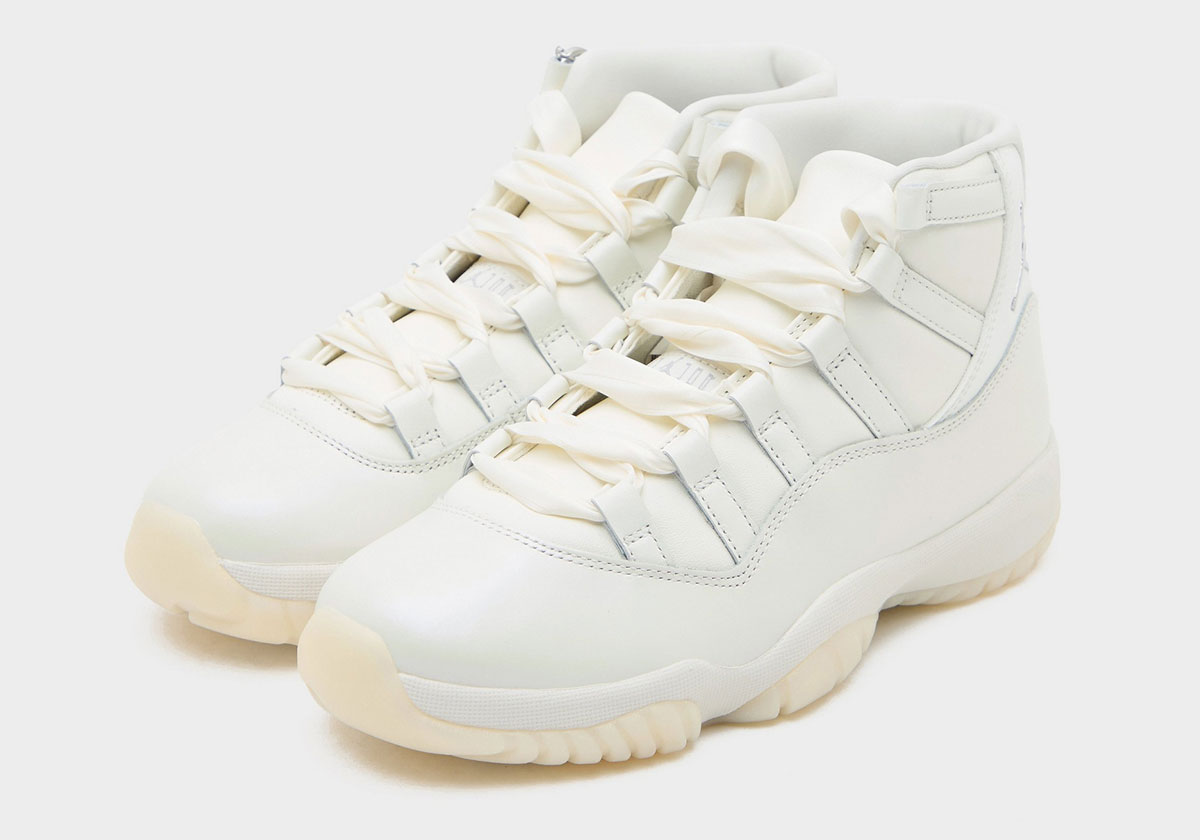Official retailer images courtesy of JD Sports show a handful of charm accessories, namely a metal loop and pearlescent charm of some kind. The gallery also lets us know that the sneaker comes with an extra set of ribbon laces, which weren’t shown in any previous looks to this point. A “Sail” leather upper sits above a “Pearl Grey” mudguard, complemented by “Metallic Silver” TPU Jumpman logos. It’s still not exactly clear what shoe’s official “Grand Finale” nickname alludes to, but we’re bound to get context as we creep closer to a release.