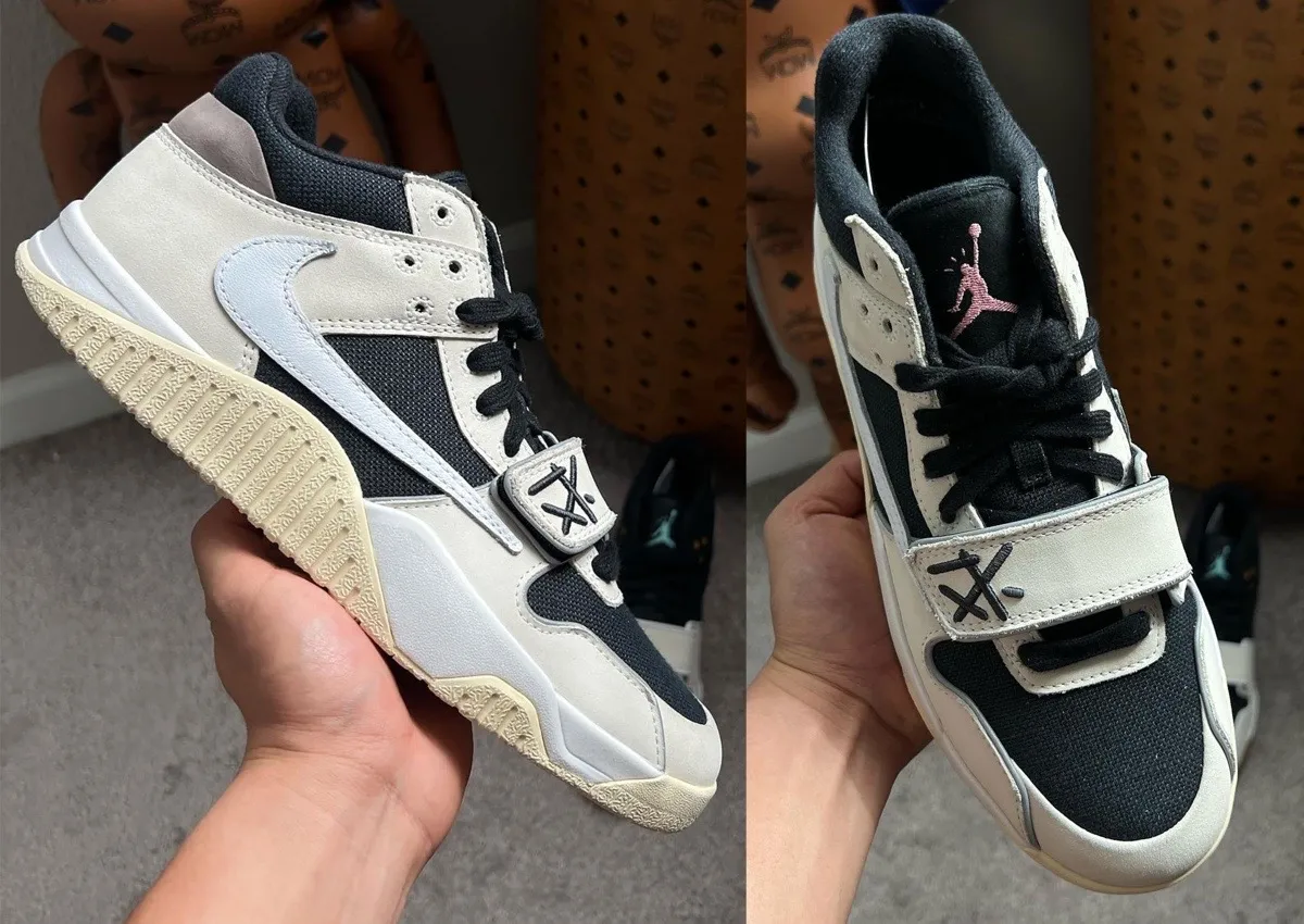 Recently surfaced samples, shared by @collectors_closet, reveal what might have been. The design carries Travis’s signature neutral palette, paired with pink accents he’s used before. A white Reverse Swoosh and black strap branding give it a unique spin, though its layout feels like an early take on the “University Red” edition.