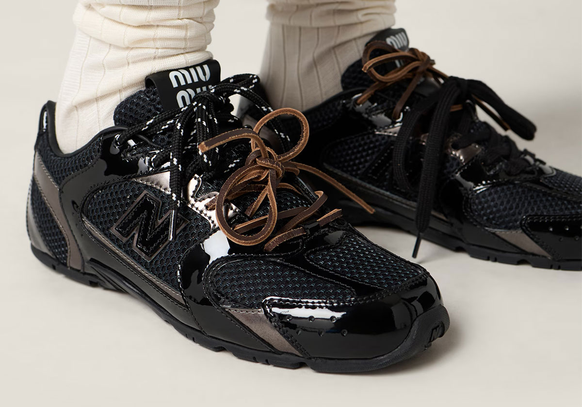 For Fall 2025, Miu Miu brings the New Balance 530 closer to home with three mesh styles; a composition known well by the standard edition. Leading the charge is an all-black colorway featuring patent leather, followed by white/silver/gold and blue suede options featuring brown gum soles. All Miu Miu 530s to this point have features all-suede or all-leather upper, but this latest batch is more in-line with the standard model’s tech runner identity.