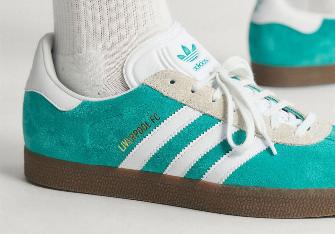 Made to match Liverpool’s recently-unveiled third kit, the sneaker features a “Sea Green” suede upper with white hits on the stripes, tongue, and backtab. The Liverpool FC crest lives on both backtabs, while dark brown gum soles make for a familiar finish underfoot. Do note that adidas’ official images show two different sneakers, one with leather and one with suede around the eyelets. It’s not clear which one buyers will end up receiving, so cop at your own discretion.